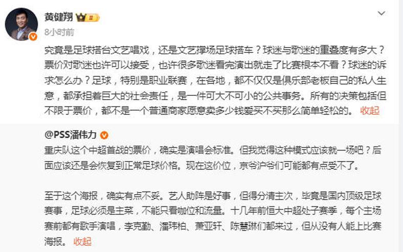 媒体人潘伟力直言不讳:“重庆队这个中超首战的票价,确实是演唱会标准,可能是把艺人出场费算进去了。至于这个海报,确实有点不妥。艺人助阵是好事,但得分清主次。十几年前恒大中超处子赛季,每个主场赛前都有歌手演唱,但从没有人能上比赛海报。”